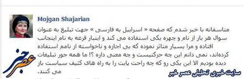 وی نوشته است: «متاسفانه با خبر شدم که صفحه « اسراییل به فارسی » جهت تبلیغ به عنوان سوال هر بار از نام و چهره یکی استفاده می کند و اینبار قرعه به نام اینجانب افتاده و مرا بسیار متاثر نموده که بی اجازه و ناخواسته از نامم استفاده کردهاند، نمی دانم این چه حرکتیست و چه معنی داره ؟! ما همه جور تبلیغات دیده بودیم الا این یکی رو که چه راحت پایت را به راه های کثیف سیاست باز می کنند.»