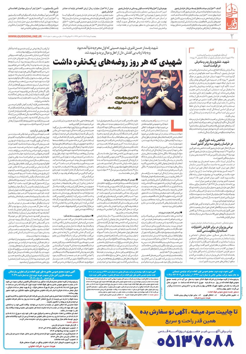 10706 - روزنامه قدس شماره ۱۰۷۰۶ - ۱۴۰۴-۰۵-۰۹