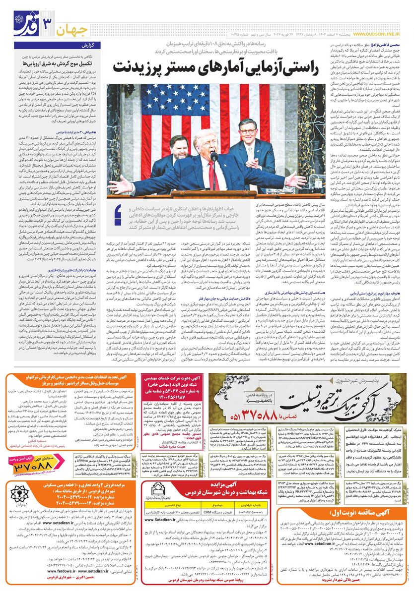 10875 - روزنامه قدس شماره ۱۰۸۷۵ - ۱۴۰۴-۱۲-۰۷