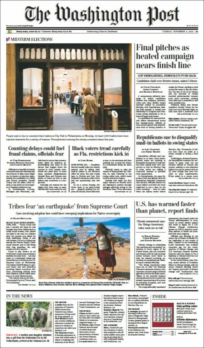 روزنامه واشنگتن پست چاپ آمریکا همانگونه که پیش بینی می شد تمرکز اصلی خود را بر آغاز انتخابات میان دوره ای در این کشور اختصاص داده است. عکس اصلی صفحه نخست این روزنامه نیز صف رای گیری در ایالت پنسیلوانیا مهمترین ایالت در میان ایالاتی که نمایندگان آن ها قصد ورود به مجلس نمایندگان را دارند اختصاص پیدا کرده است. این روزنامه می نویسد صحبت ها مبنی بر تاخیر زیاد احتمالی در شمارش آرا می تواند دوباره بحث در خصوص احتمال تقلب در انتخابات را در این کشور داغ کند. واشنگتن پست همچنین در گزارشی تاکید می کند ایالات متحده بیشتر از میانگین جهانی در حال گرم تر شدن به دلیل تغییرات آب و هوایی است.
