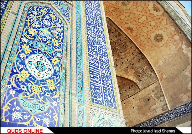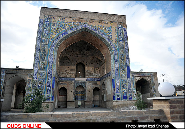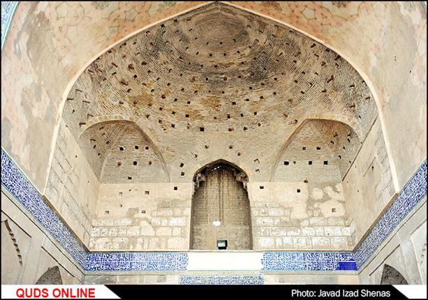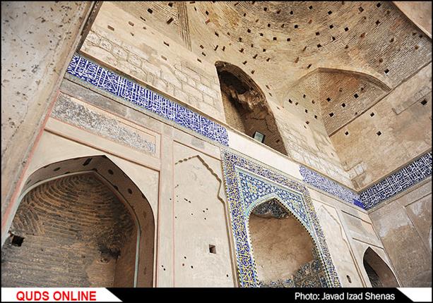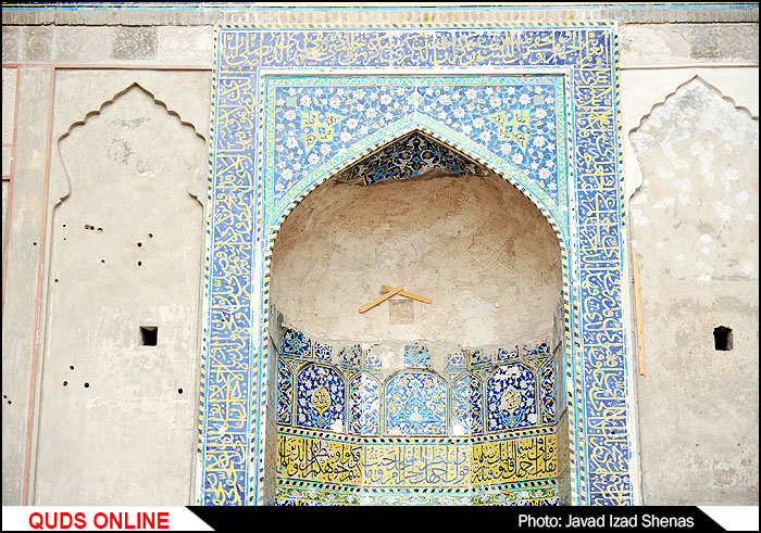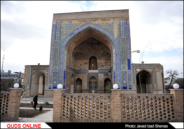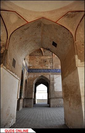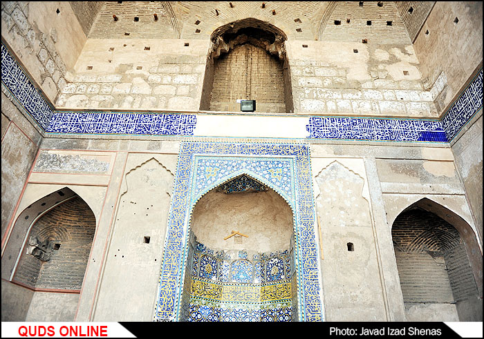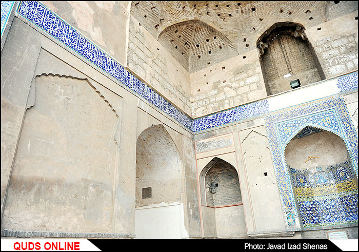 قدس آنلاین : مصلی پایین خیابان دارای ایوانی رفیع با دو ایوانچه در اطراف آن است که با فضای مربع شکل آن متقارن بوده که ایوان آن به سمت قبله و بر روی فضاهای مربع یا رواق گنبدهایی با خیز کم ساخته شده است. پوشش ایوان گنبدی از کاشی های معرق عهد صفویه است. داخل بنا با کتیبه هایی با مضامین آیات قرآن به خط ثلث تزیین شده است.